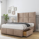 Beige upholstered bed with storage drawers in a bedroom setting.